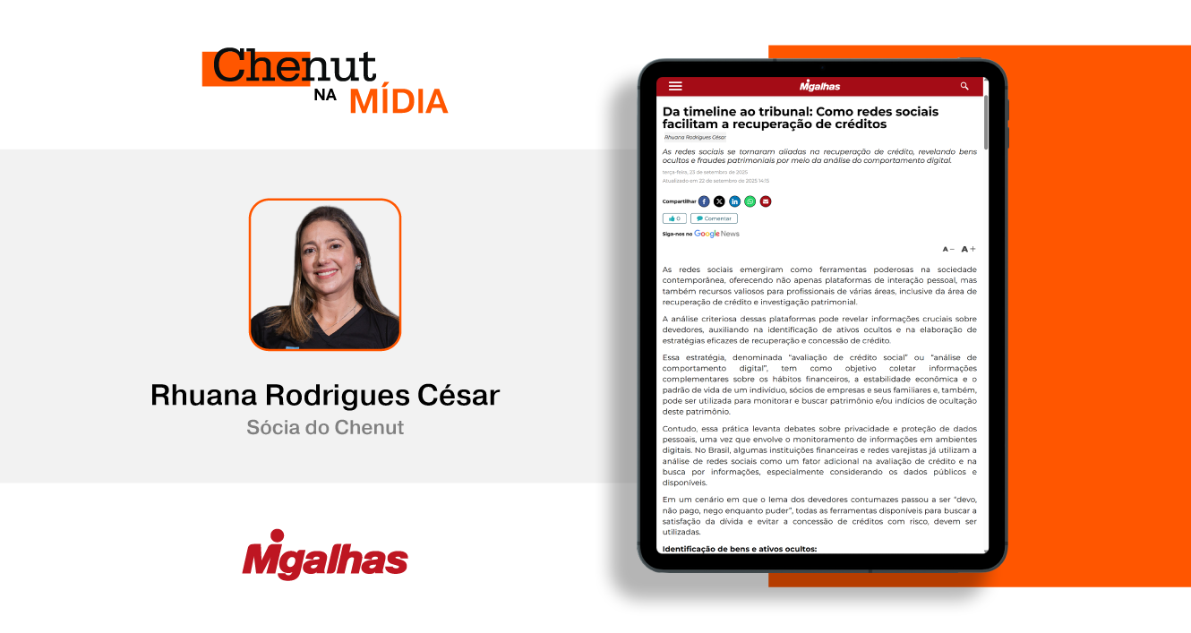 Em artigo publicado no Migalhas, a sócia do Chenut, Rhuana Rodrigues César, analisa o tema “Da timeline ao tribunal: Como redes sociais facilitam a recuperação de créditos”.