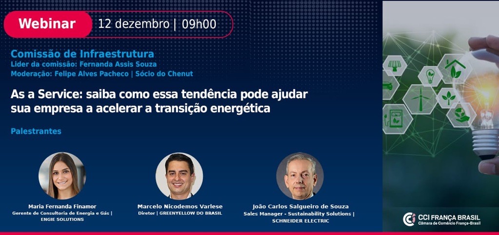 No dia 12 de dezembro, a Comissão de Infraestrutura da CCIFB-SP promove o webinar “As a Service: saiba como essa tendência pode ajudar sua empresa a acelerar a transição energética”. Este evento tem o objetivo de discutir o cenário atual do setor elétrico, destacando os principais desafios relacionados ao consumo e à sustentabilidade, e apresentará estratégias práticas para economia e descarbonização, com base em projetos estruturados que aliam inovação e eficiência.