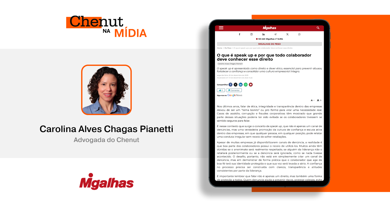 Carolina Alves Chagas Pianetti, advogada do Chenut, escreveu o artigo “O que é speak up e por que todo colaborador deve conhecer esse direito”, recentemente publicado no Migalhas.