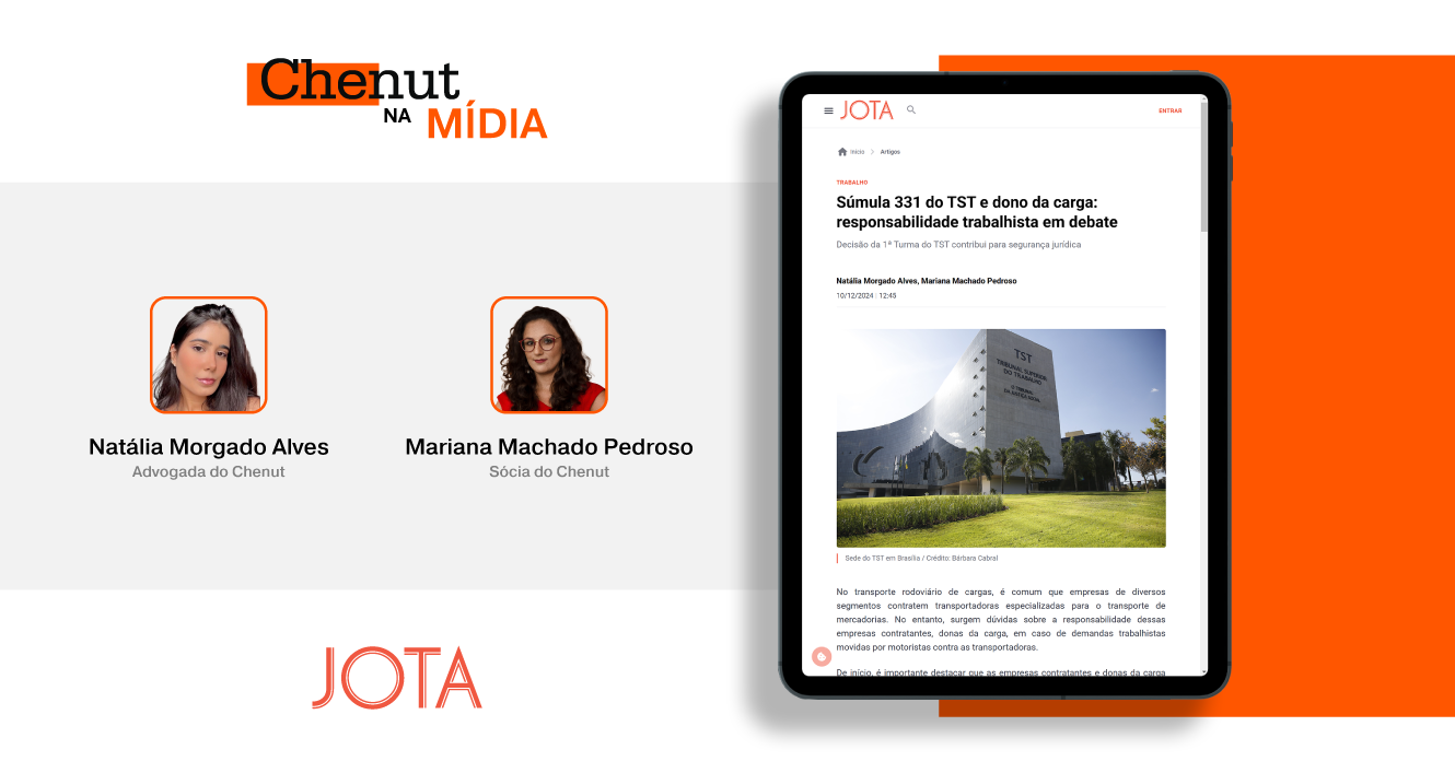 Natália Morgado Alves, advogada do Chenut, e Mariana Machado Pedroso, sócia da equipe, tiveram o artigo “Súmula 331 do TST e dono da carga: responsabilidade trabalhista em debate” publicado no portal JOTA.